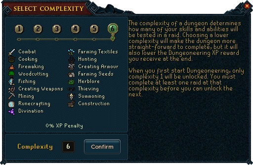Spelers mogen geen voorwerpen mee brengen in de kerkers. Spelers kunnen dood gaan tijdens het trainen van de skill maar respawnen gewoon in de eerste kamer van de dungeon. Spelers die voorwerpen bij zich hadden (die verkrijgbaar zijn tijdens de skill), en dood gaan, zullen deze voorwerpen niet verliezen. Spelers kunnen unieke voorwerpen krijgen die nergens anders verkrijgbaar zijn in Gielinor. Spelers kunnen voorwerpen ruilen voor tokens, die spelers krijgen bij het voltooien van elke dungeon.