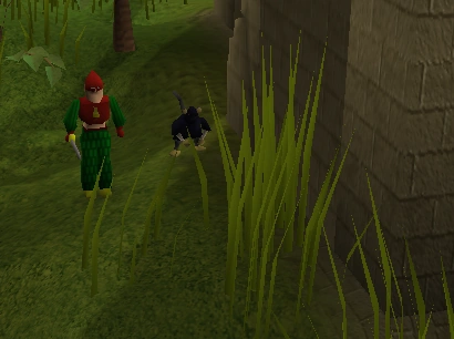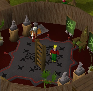 Loop terug naar de stad en laat je weer vangen door de archers (Protect from Missiles aan!). Ontsnap weer uit de gevangenis en loop de tempel in met protect from Melee aan. Laad daar je prayer op als dat nodig is, er is namelijk een altaar. Sommige mensen trainen hier op de apen, dan hoeven ze geen voedsel te gebruiken. Ze kunnen dan steeds hun prayer aanhouden en het steeds weer opladen.