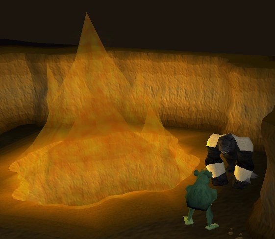 Ga weer naar Ape Atoll via Daero bij de bar van de Grand Tree te praten, naar Crash Island te vliegen en te varen naar Ape Atoll. Ga nu niet naar het noordwesten, maar loop naar het westen tot de tunnel met de (!) op de kaart of "Zooknock" op het plattegrondje hierboven. Haal eventueel nog een plank uit het huisje ten westen van de tunnel. Achterin de grot zit Zooknock, daar moest je heen van de sergeant. Loop als je de grot binnen bent naar de noordelijke gang en volg de lange tunnel. Het lijkt even of je rondjes loopt, maar als dat goed is, doe je dat niet. Zet Protect from Melee aan en let op je energy en je prayer potions. Drink een potion wanneer je dat nodig vindt.
