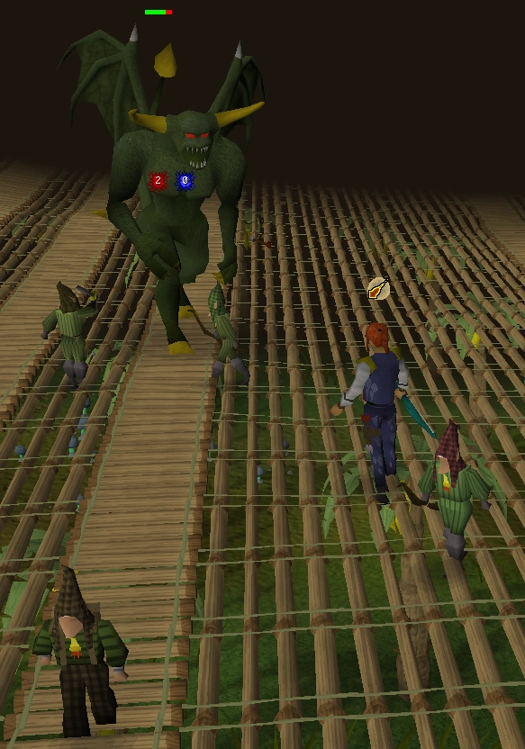 Drink voordat je je sigil aan doet, alvast je potions. Zet tijdens het vechten Protect from Magic aan. Tijdens het gevecht wordt je geholpen door verschillende boogschietende gnomes. Je kunt proberen om deze gnomes tussen jou en de demon te krijgen, zodat je niet met melee wordt aangevallen en alleen Protect from Magic aan hoeft te zetten. Ook kun je op de brug aan de rand van de arena veilig staan. Jij moet uiteindelijk degene zijn die de demon de laatste slag toebrengt. Je verliest waarschijnlijk je sigil als je dood gaat tijdens het vechten. Je moet dan een nieuwe sigil halen door met een gnome die bij Zooknock in de grot is, praten. Als je de demon verslagen hebt, moet je met de sergeant praten die daar staat. Hij vertelt je dat je met Zooknock moet praten, die je naar Ape Atoll teleporteert. Ga terug naar de boot van Lumdo, vlieg terug naar de Grand Tree en praat met King Narnode. Ga daarna naar Daero voor je combat xp.