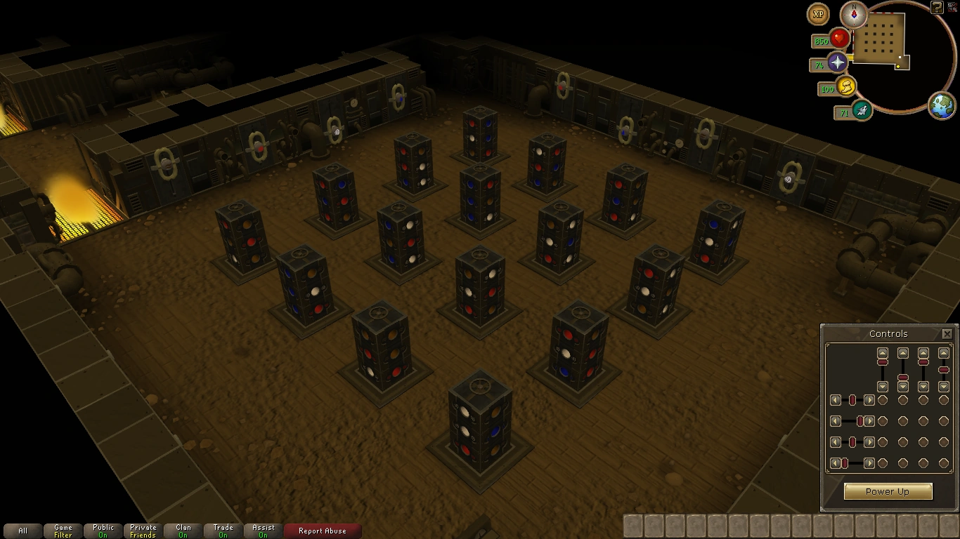 A ideia por trás desse quebra-cabeça é alinhar os círculos de mesma cor nos pilares ao longo de uma linha e, em seguida, atirar as runas apropriada através dos furos de cor (vermelho = Fogo, Azul = Água, Marrom = Terra, Ar = Branco). Pense nisso desta maneira: você está atirando através dos furos nos pilares, mas todas as cores buracos alinhados deve corresponder a runa, ou o tiro vai ser interrompido. Utilize o Painel de controle no canto a sudeste da sala para girar os pilares para que as cores em que eles se alinhem. Clique nos pontos que representam os pilares e use as runas adequadas sobre os emissores ao longo da parede norte e leste. Algumas começam com runas, mas as runas podem não estar corretas. Se assim for, basta remover as runas clicando no emissores e adicionando novos. Quando tudo estiver pronto, use a opção "Ativar" no painel de controle para atirar as runas. Todas as linhas de pilares devem ter uma chance de energia runa através deles.