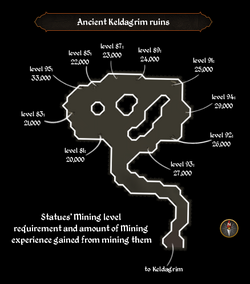 The Ancient Keldagrim ruins is a dungeon first encountered during the Birthright of the Dwarves quest. In this quest, during a memory, you will find Hreidmar on his knees talking to Zamorak. After using the Memory wand on Zamorak to restore the memory to its correct form, you notice that Hreidmar is talking to a broken statue.