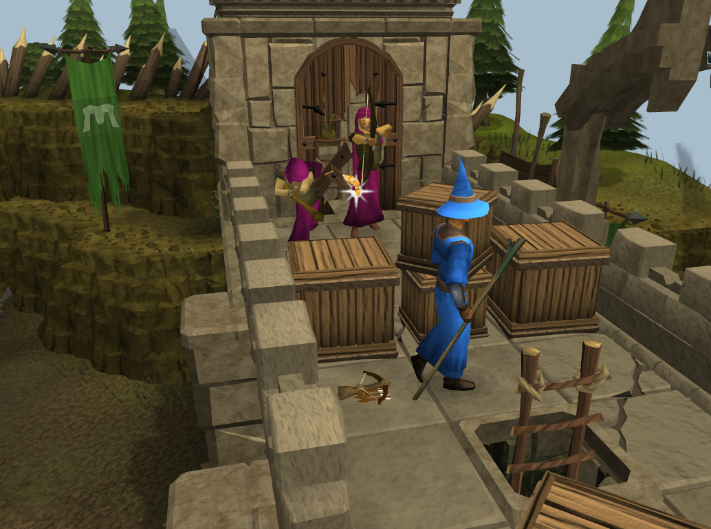 At the end of the cut scene, two H.A.M. members show up and start attacking the goblins with Magic and Ranged. Take the path around the back (west side) of the buildings, but stay out of the attack range. When you get to the tower, climb up the ladder and kill the H.A.M. mage and H.A.M. ranger with either mage or range. The Magic-Using H.A.M. member NEVER splashes, no matter what armour you wear.