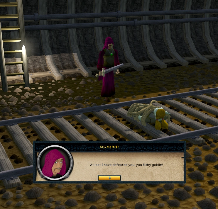 Sigmund plans to kill Zanik on the train tracks between Keldagrim and Dorgesh-Kaan, making it look like an accident so that war will break out between the dwarves and the goblins. You cannot enter through the Dorgesh-Kaan entrance this time, so you must go to the swamp cave entrance and meet the goblin warriors who will be helping you.