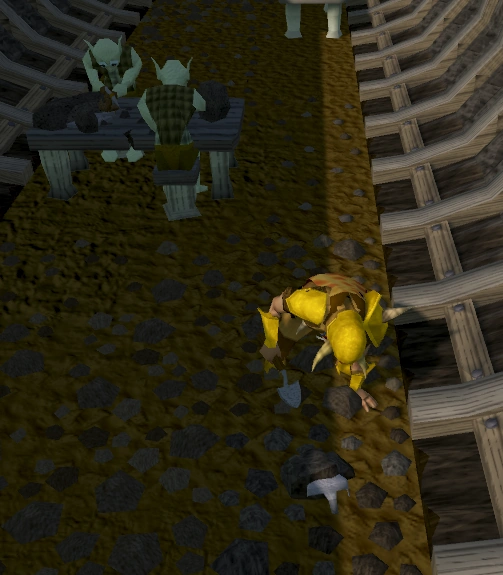 Do not attack any guards, even the ones that are fighting the goblins, as doing so will result in getting caught. If a guard does see you, quickly run to the goblins before he gets near you, as you will be forced to restart from the entrance to the caves should he get too near.