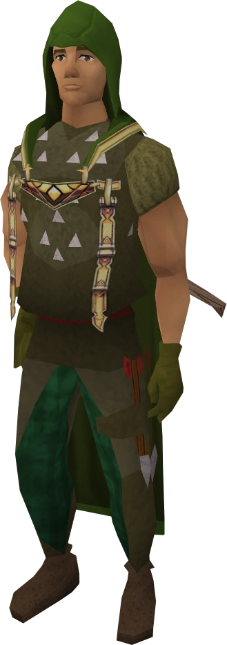 Aaron the armour salesman is the owner of Aaron's Archery Appendages in the Ranging Guild. He sells low level ranger armour and the Ranged cape Cape of Accomplishment for 99,000 coins to players with 99 Ranged.