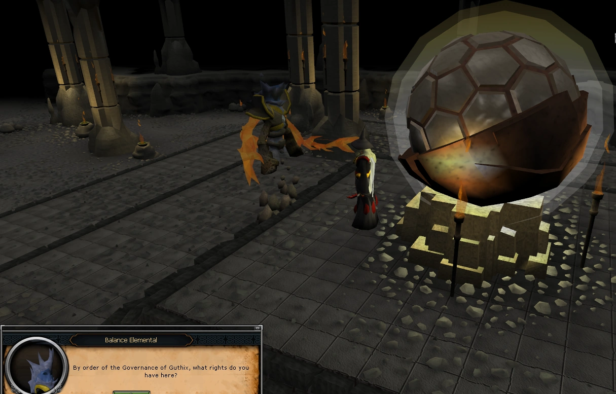 The Balance Elemental will appear from the Stone of Jas once a player touches it. It begins the fight using Ranged, but will readily switch to other attack types. Like players, there is a small delay when it switches combat styles, and it usually uses that same attack for 3-4 hits in a row. If you die during the battle, your gravestone will appear next to Movario and Darve in the Tears of Guthix cavern.