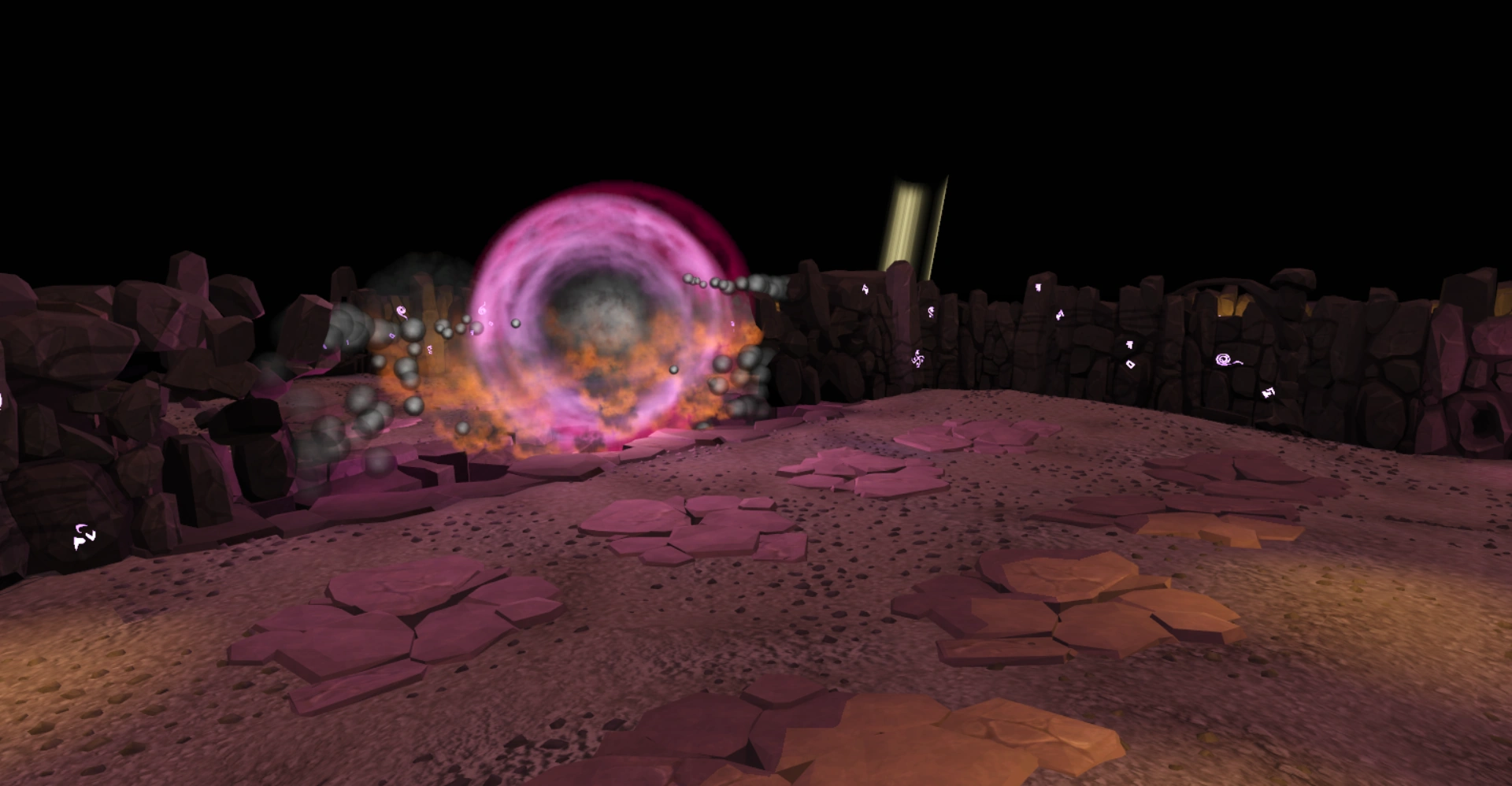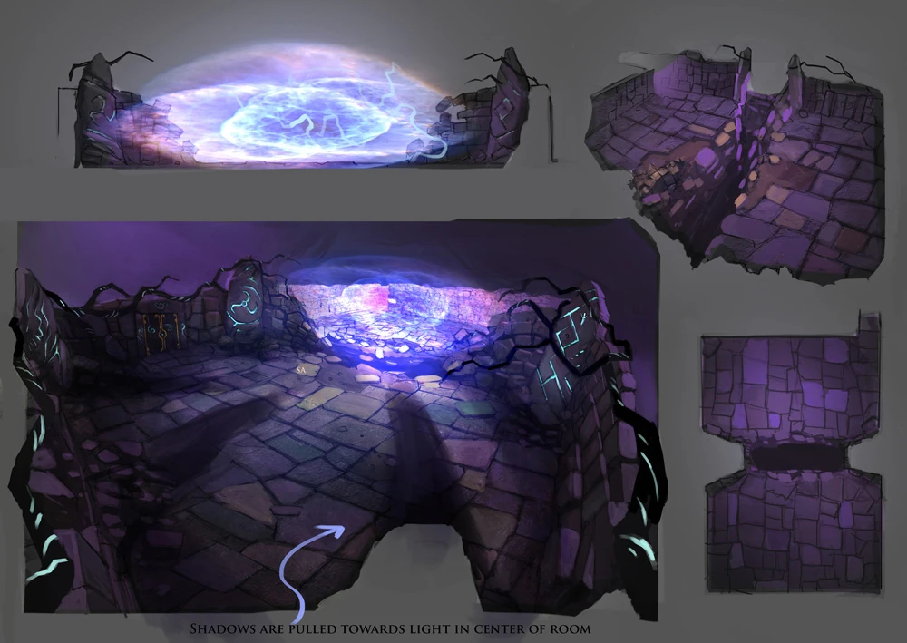When a player steps over the western pressure pads, the dungeon will become unstable and collapse as the shadow portal was supporting it, and players have 30 seconds to escape. The dungeon will get several changes. The small 3x2 pads begin to emit purple mist, which periodically deals damage to players near or on it. Several sections of the wall will collapse on themselves, sending out piles of rock which can damage players and act as solid obstacles. The bridges used to enter the area will also be destroyed, forcing players to use a narrow path jutting out from the chasm the bridge was on or use a vine/stepping stone to get across. As time elapses, the camera begins to tilt towards one side. If the player(s) do not get out within 30 seconds, explosions start appearing and will damage players for up to 1,500 per hit.