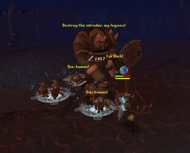 Bork is a big ork initially summoned by Surok Magis in The Hunt for Surok. After the miniquest, he is controlled by a Dagon'hai Elite. Bork can be fought once per day in the Chaos Tunnels. The very first kill earns players 5,000 Slayer experience; afterwards it will only award 1,500 experience, which can be doubled if the player has completed the hard Varrock achievements (Varrock armour 3 does not need to be worn for the doubling boost).