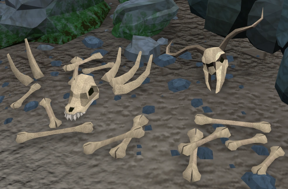 Animal skulls and bone scraps for the pit and decorations are taken from the Spoil Heap pile in the western corner of the small cavern located southeast of the goblins where the Juvenile Wolves are found.