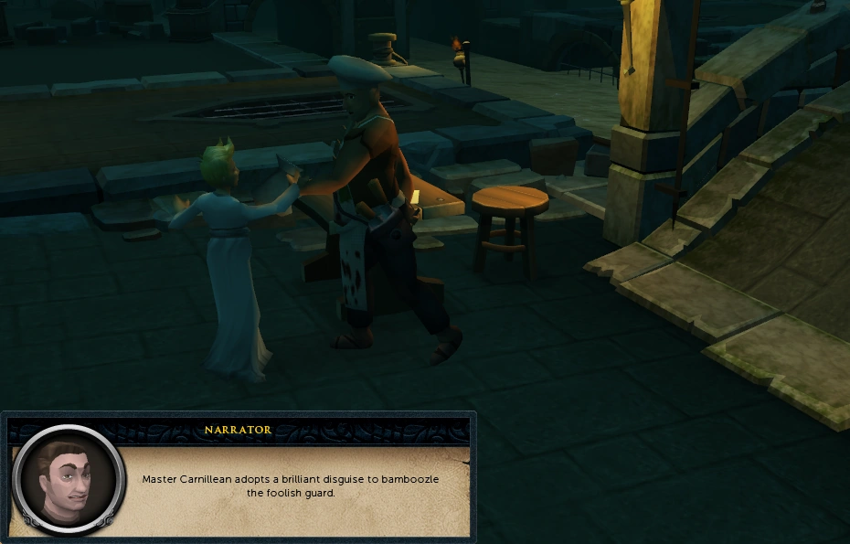 A funny moment occurs while Philipe tries to sneak past the guards; after he gives up, talk to Slimepits. As soon as Butler Crichton narrates, wait for a few moments. Do not go forward with the dialogue or Philipe will not be able to bypass the guards.
