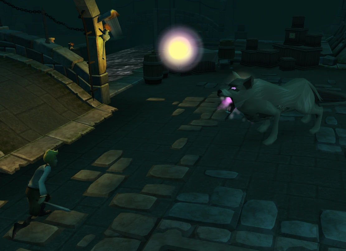 A good technique is to lure the wolf to the bridge on the opposite side of the "Damsel in Distress" and trap it there. If the player stands back far enough on the bridge, the wolf will be unable to attack. The wolf will occasionally direct its attention to Phillipe, but simply clicking the wolf will bring its attention back to you (even if you're standing a few steps away). Another technique would be to run circles around the wolf until Phillipe kills it, as the magic orb won't do damage if you are out of its Area of Effect, and most if not all of the stalactites will miss you.