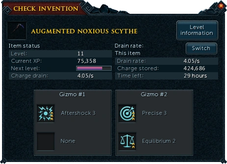 Augmented items (whether or not they have gizmos) no longer use the equipment degradation system, and instead drain charge from the central charge pool each second of combat. This applies to all augmented items including those that did not degrade before augmentation. This rate depends on the item that has been augmented, and can be reduced by researching charge drain reduction.