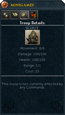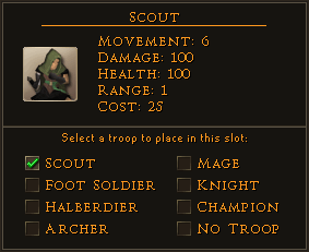 With great speed and movement, scouts are often deployed first in Conquest battles. They are poor fighters, but can move great distances (crossing more than half the board with the Charge command) and are ideal for attacking enemy ranged units such as Archers. When Battle Cry is used on them, they can take out all units other than champions. Because of their low price, they are often treated as sacrificial units, killing a single target and then leaving themselves open to retaliation.