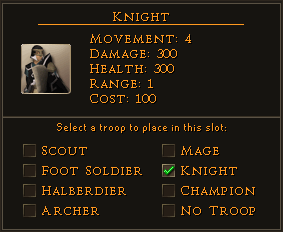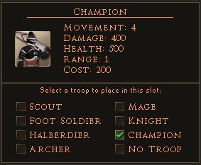 Champions are the strongest unit on the battlefield. Their movement is the same as a foot soldier, but they have high damage and hitpoints, and can kill most units in one hit. Though they must be wary of ranged units. A full-health champion can only be killed in one shot by using Battle Cry on a Knight or another Champion.