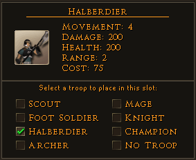 The only melee troop with a range of more than one, Halberdiers can target enemy melee units without taking damage in retaliation. They can be protected by screening them with other units.