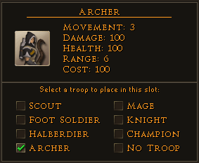 Archers have the longest range in the Conquest minigame, and can give the player the upper hand if deployed on enemy units before they reach a player's ranks. However, they are weak in close combat, and can be easily killed by any unit that manages to reach them. If used, they are often an early target for enemy Scouts, which can sacrifice themselves in a favorable trade.