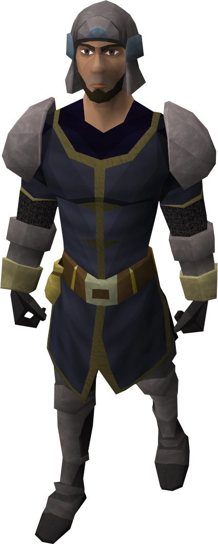 He runs a shop by the name of Burthorpe Guard Quartermaster, which provides some basic supplies for those training on the trolls within the cave, and he is willing to purchase the items that the trolls drop, or "spoils of war" as he refers to them.