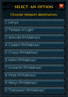 The crystal teleport seed has four right click options which can be unlocked after the appropriate quests have been completed (see below). The Prifddinas option opens a dialogue box which allows the player to teleport to any of the eight elf clan districts in the city. Players may have to speak to Eluned in forest South of Lletya (not via the NPC contact spell) if their crystal teleport seed is missing any right click options that should be unlocked. This will only work when carrying one seed, carrying multiple seeds will prevent the teleport from being added.
