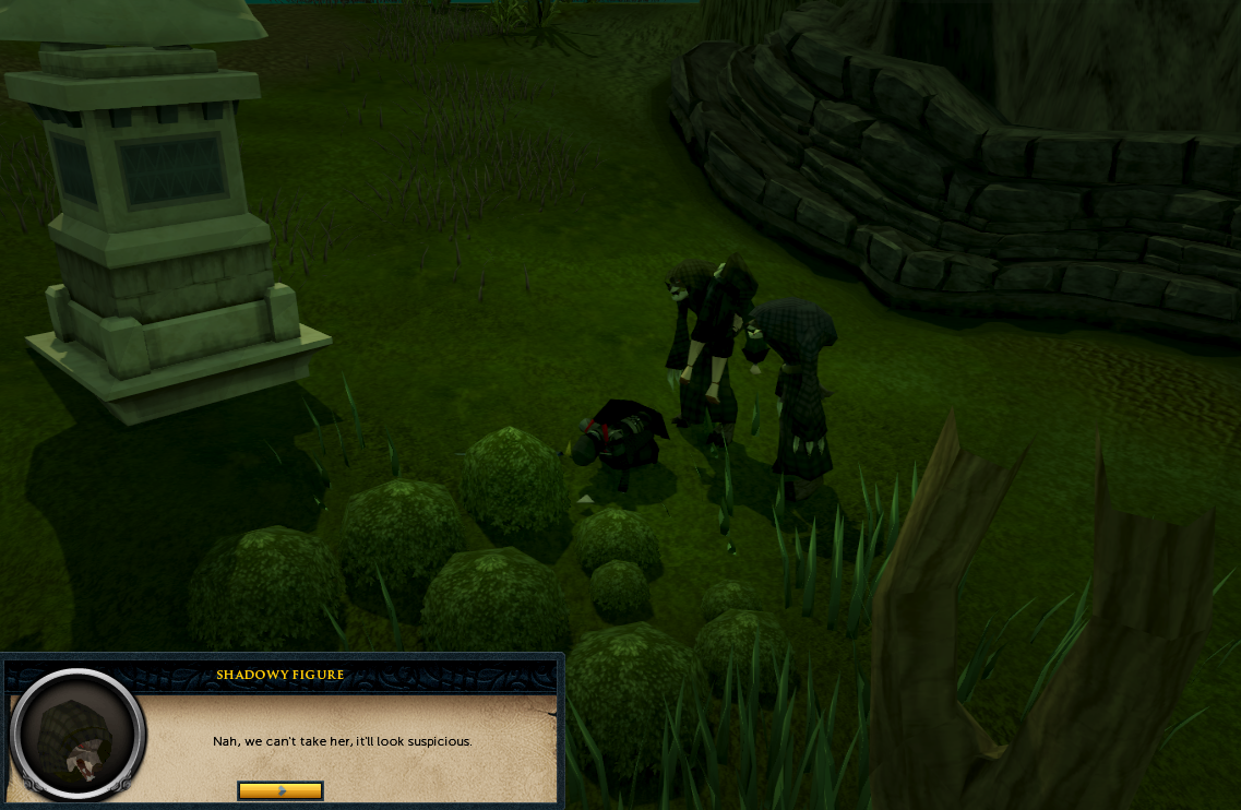 Go to Drezel, who is in the catacomb beneath the temple; he will say that he and Ivan Strom have been hearing strange noises, almost animal voices, outside the temple and would like you to investigate, preferably to the west of the stairs. He will also say that people have gone missing while at the Silvarea mining site. Finally he exclaims his praise over Ivan and sees in him his successor as Paterdomus's protector. Exit the mausoleum (temple side) and go southwest of the main stairs in front of the temple. Look for a bush that is searchable just down the steps. A short cutscene will follow where you will find an unconscious man and then be knocked out by a shadowy figure. Two werewolves have managed to get across the River Salve and are "collecting" humans to pay the extra blood tithes which Gadderanks had mentioned during In Aid of the Myreque.