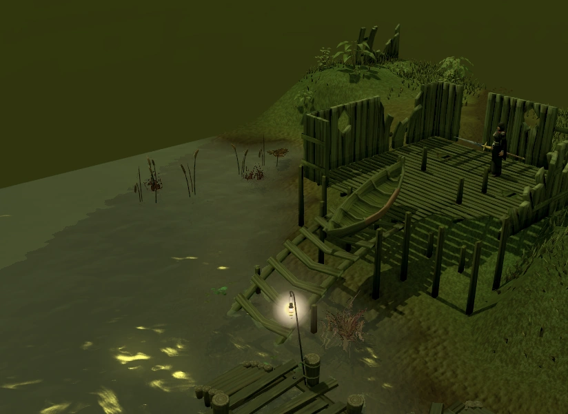 Leave the basement and go south-east to a dilapidated hut with a boat in it. It is south of the furnace. Be careful around the boat shed and the sea end of the wall as Vyrewatch hang around there - two Vyrewatch at the boat shed and three at the wall. You will need to repair the boat using a plank and 4 nails of any metal. You will then need to repair the launching chute with the same materials. Push the boat and it will slide down the chute into the water.