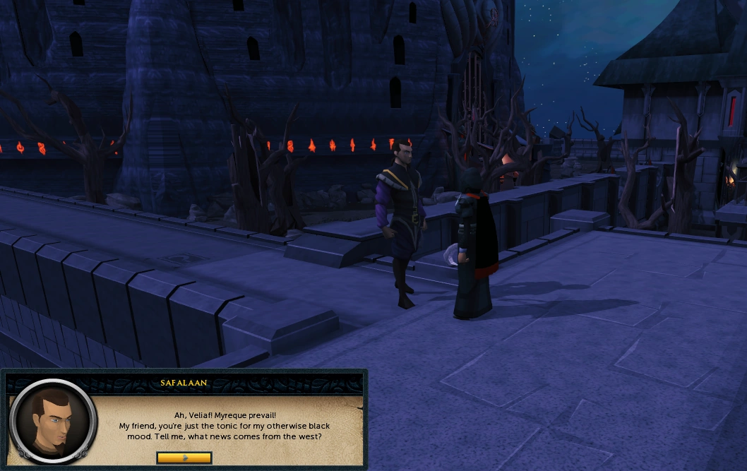 Fighting tooth and nail against the vampyre overlord, Drakan, the Myreque have moved their secret base camp to Burgh de Rott. Now the fight starts in earnest! Veliaf needs someone to make their way into the Sanguinesti region - the eastern side of Morytania cut off from the west behind an impenetrably huge wall.