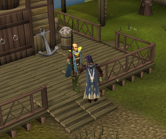 Speak to 'The Guns', Jones's cousin who may be found lifting a log just outside of the tower. He claims that he would be more than willing to assist with the endeavour, but his seasickness prevents him from travelling out to sea. However, he mentions that his cousin usually made him a sea legs potion whenever they went fishing.