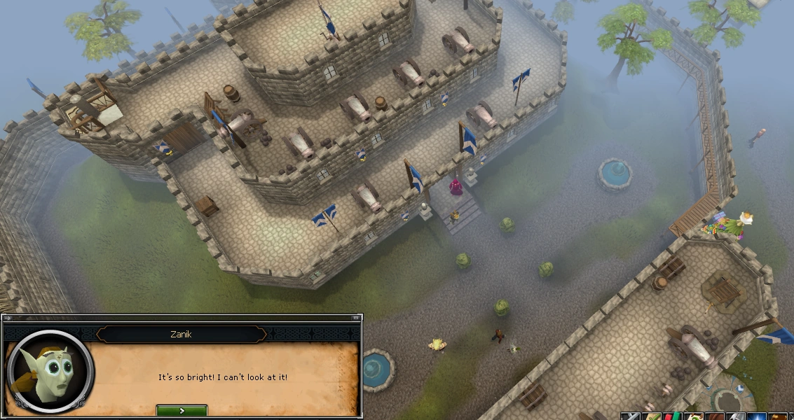 - Take her to see a level 2 Goblin (there's several across the bridge, just east of the castle). Try to get Zanik to walk into the goblin. If Zanik doesn't automatically talk when in close range of a goblin, log out then back in.