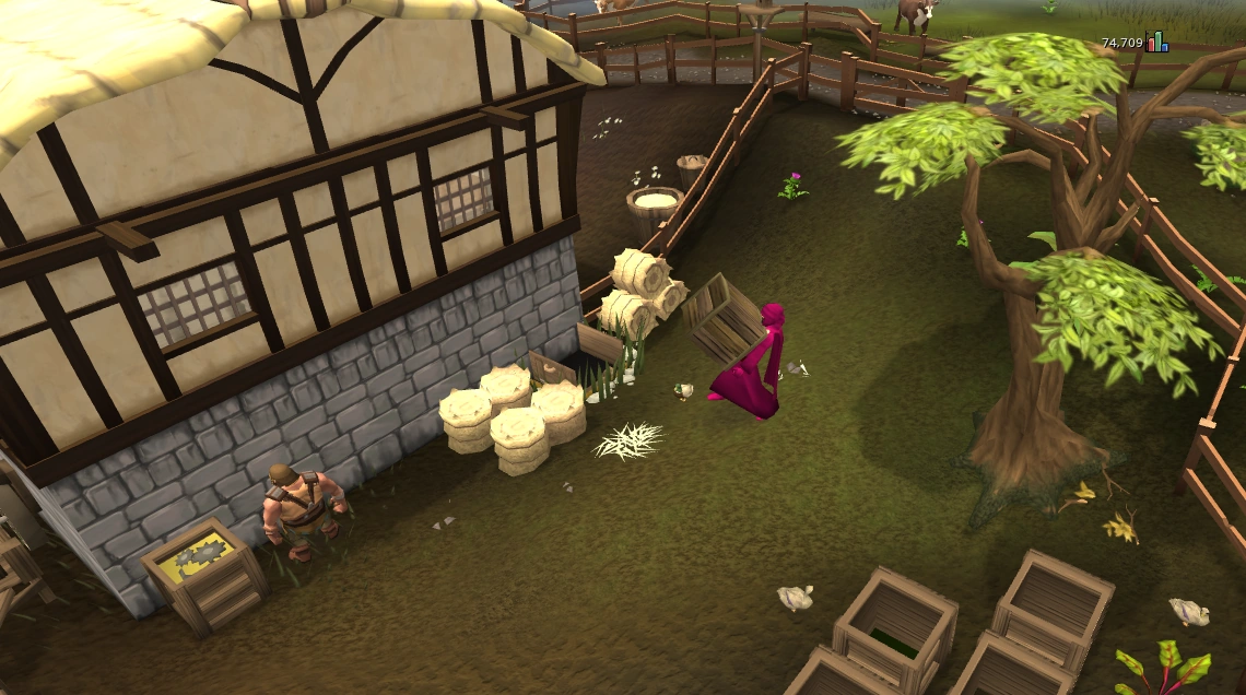 After the cutscene, home teleport to Lumbridge and head to the Lumbridge Castle basement using the trapdoor in the kitchen. Get Zanik to follow you again and make your way to the Lumbridge Watermill. Go across the bridge to the east bank of River Lum and travel north until you find a cow pasture on one side of the road and a farm with Chickens on the other.