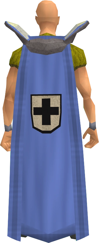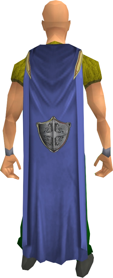 The Defence cape is the Cape of Accomplishment for the Defence skill. It can be purchased for 99,000 coins alongside the Defence hood from Harlan the Melee instructor by players who have achieved level 99 Defence.