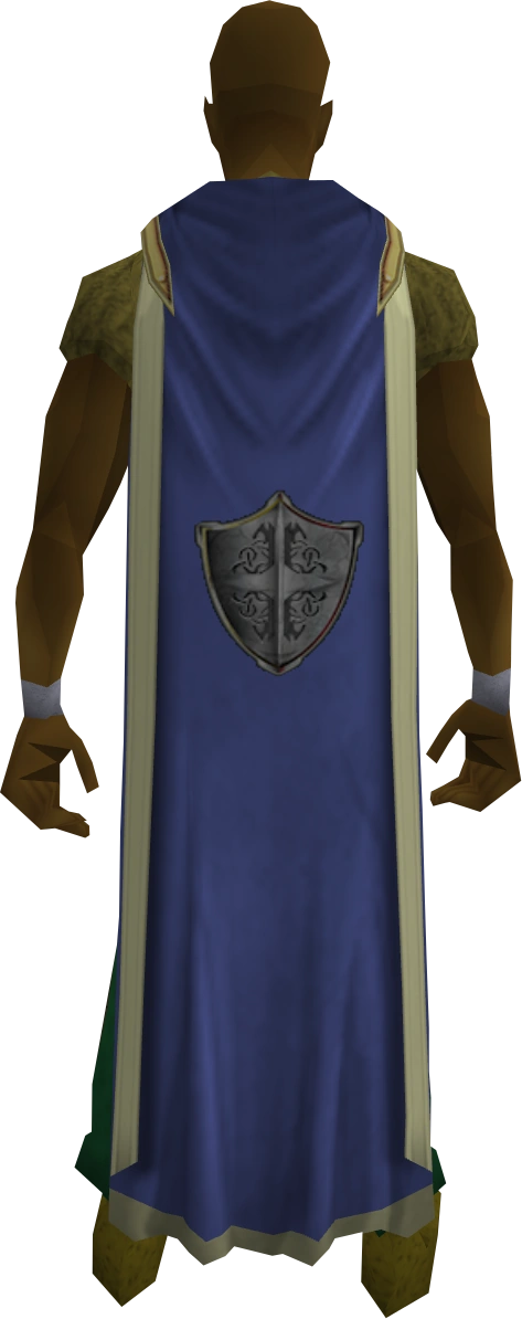 The Defence cape (t) is the trimmed Cape of Accomplishment for the Defence skill. It is the trimmed version of the defence cape. It can be purchased for 99,000 coins alongside the Defence hood from Harlan the Melee instructor or Elen Anterth in Prifddinas by players who have achieved level 99 Defence and also have one other level 99 skill.