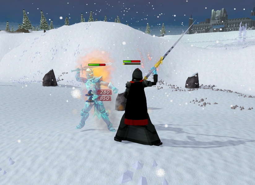 Fire spells do considerably high damage to the ice trolls, and is thus recommended to use. As your stats are constantly falling in this environment, you must drink restore potions when your magic falls below the required level. It is also advised to Protect from Melee against the trolls.