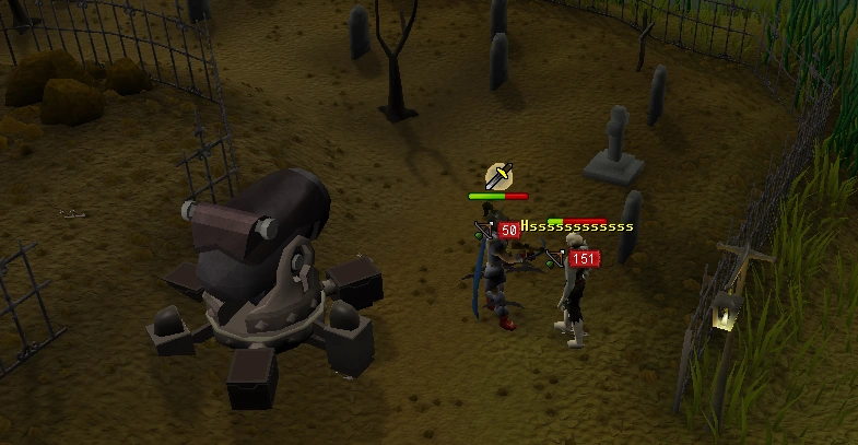 A player using a dwarf multicannon to fight Dessous.