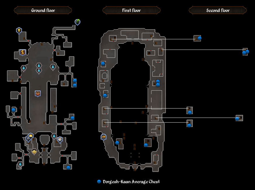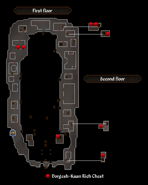 Dorgesh-Kaan has many features that players training Thieving will find appealing. There are 25 chests (8 rich, 17 average) throughout the city containing a wide variety of loot such as gems, lamps, ore, frog-leather armour, and Summoning charms (mostly green). Most cave goblins can also be pickpocketed, and the wire machine in the south side of the city can be stolen from.