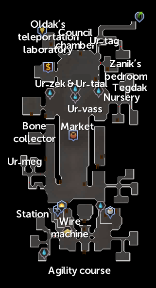 - The Dorgesh-Kaan–Keldagrim train system may be used to travel to Dorgesh-Kaan from Keldagrim by rail (after Another Slice of H.A.M.), and vise-versa. The tickets are free; a player only needs to wait less than a minute in the carriage for the departure. The train station is located on the 1st floor[UK], in the south-west corner of the city.