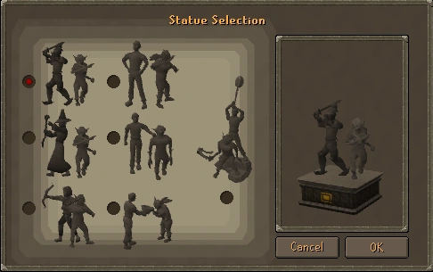 The player can choose one of seven designs for their statue by talking to Ur-vass, a Dorgeshuun Councilman that wanders the park area near the statue.