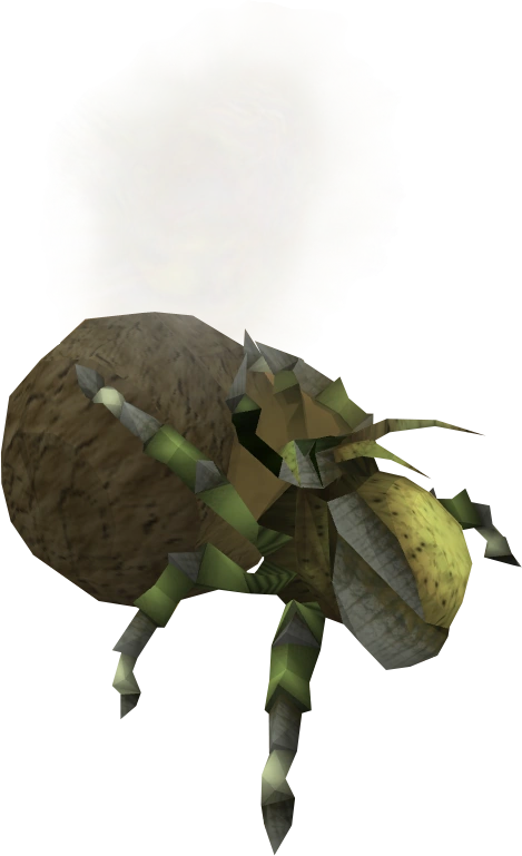Dung kalphites are kalphite larvae that roll dung. They are found in the Kalphite nursery during and after the Diamond in the Rough quest. Unlike the kalphite larvae in the main Kalphite Hive, dung kalphites can be interacted with: players can use a slashing or stabbing weapon to slice the dung ball they're pushing, yielding mostly minor rewards. The kalphite will then flee. Off-hand weapons do not work for this purpose. These do not count towards fulfilling a Slayer task for kalphites, as they are not killed - they simply burrow back into the nursery.