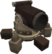 The cannon consists of four pieces: the base, the stand, the furnace, and the barrels. After a player has loaded cannonballs into the cannon, the cannon rotates and fires automatically at any attackable monsters nearby, causing damage to them.