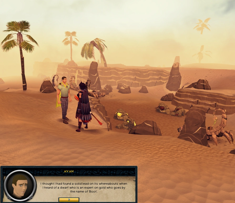 Head there and talk to Avan, the man with a yellow cape wandering around the pit entrance. He tells you that he is trying to win the affection of a certain lady by gifting her a ruby-studded ring and necklace made out of 'perfect' gold. Unfortunately, the stuff here in the desert isn't nearly good enough for him. He'll tell you about a dwarf named Boot who might know the whereabouts of this 'perfect' gold.