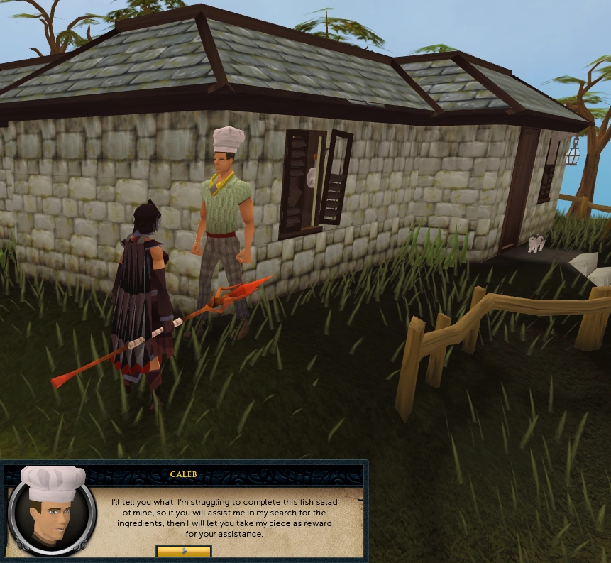 Since a broken crest is of no use to anyone, he agrees to exchange it for some fish that he needs for a special and unique salad he is currently making. What you need is a shrimp, salmon, tuna, bass, and swordfish — all cooked. If you need to catch the fish yourself, head west towards Gunnarsgrunn to fish the salmon (fly) and then teleport to Catherby where you can fish for the tuna and swordfish (harpoon or barehanded), shrimp (small net) and the bass (large net). If you are fishing and cooking your own fish, you will need up to level 50 Fishing and 45 Cooking for the swordfish. There is a range in Catherby just north of the bank where you can cook your fish.