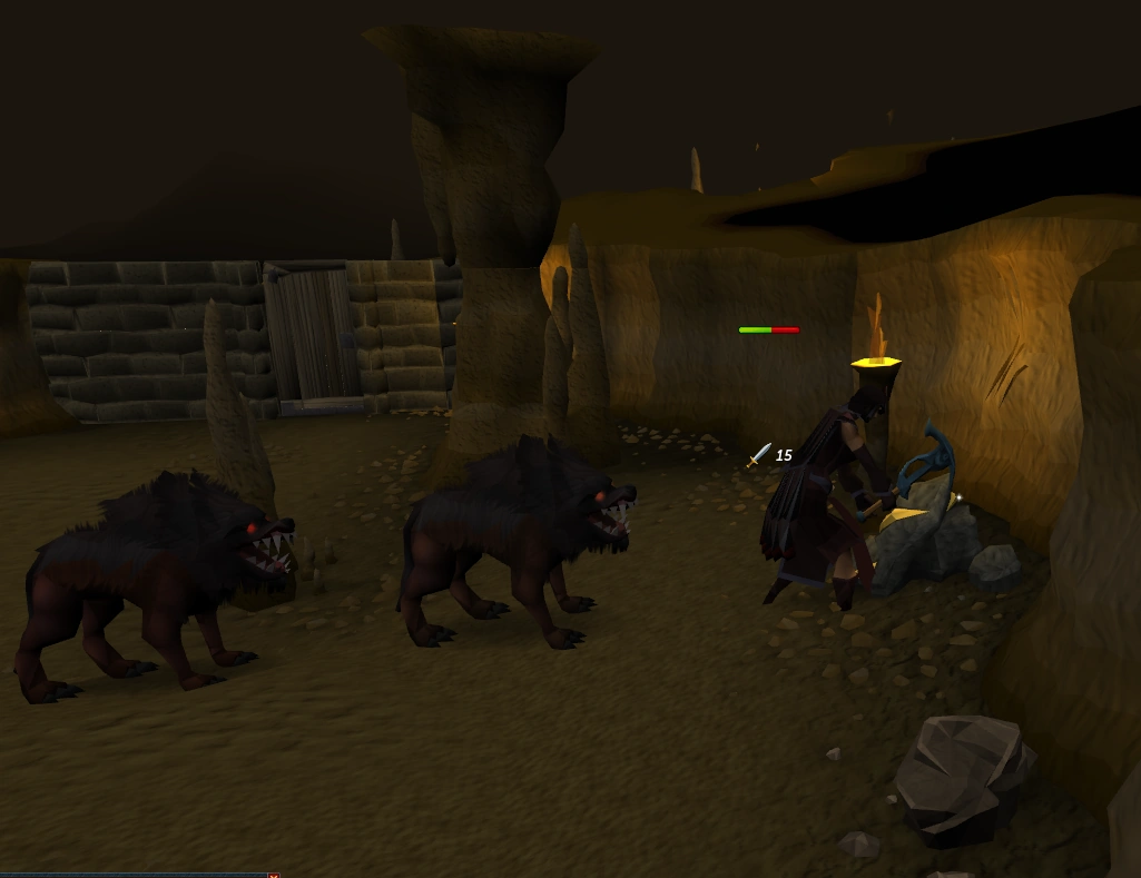 Keep following the path and then head south to a small caged area that holds a couple of hellhounds, along with the 'perfect' gold rocks. To the north and south are two rooms with levers in and outside of them - you'll have to do a lever puzzle to unlock the gate to the caged area.