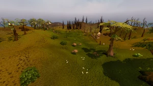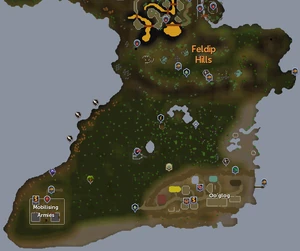 The Feldip Hills are positioned to the south of Yanille and Kandarin and southeast of the Castle Wars arena. They are mostly populated by ogres. The capital of the Feldip Hills is the city of Gu'Tanoth; to the west of Gu'Tanoth is Jiggig. Jiggig is filled with Zogres and Skogres (zombie and skeleton ogres, respectively). In the southern areas is a Hunter training area. The Feldip Hills are only accessible for members who completed the Watchtower quest. After completing the quest Big Chompy Bird Hunting, the hunting area can be used to hunt Chompies. In the south-east of the area, is the city of Oo'glog. Also note, to the west near the coast, north of the fishing spots, is a Death rune spawn. Despite the fact that this area is called Feldip Hills, its middle part consists of jungle and southern part consists of Eucalyptus trees.