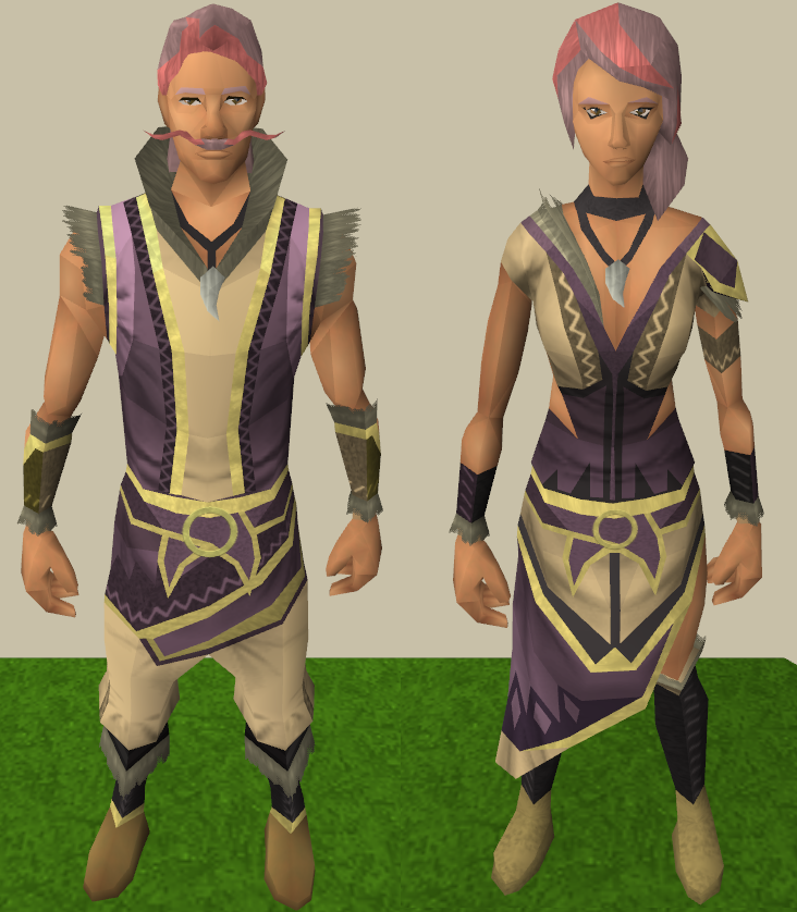 Players are generally not restricted on the clothes or armour they can wear based on their gender. For example, both male and female player characters may wear plateskirts, platelegs, and skirts.