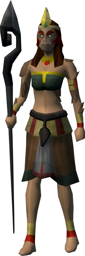 Apmeken is the goddess of friendship and sociality, and, is most unpredictable and playful of the desert gods. She tends to appeal to people who desire mental pleasures which are generally scholars and sometimes downright dishonest people. Apmeken can change her appearance at will, although she always has the head of a monkey, ape, or baboon, depending on the exact nature she is displaying. The monkey represents skillfulness, the ape is wise, and the baboon, in nearly all situations, is comical. According to Jex, Apmeken left the Kharidian Desert at some point, however, due to her going into hiding when Amascut massacred her followers using demons made from Apmeken's senses, which she had stolen. In the Fifth Age, she regained these senses and returned.