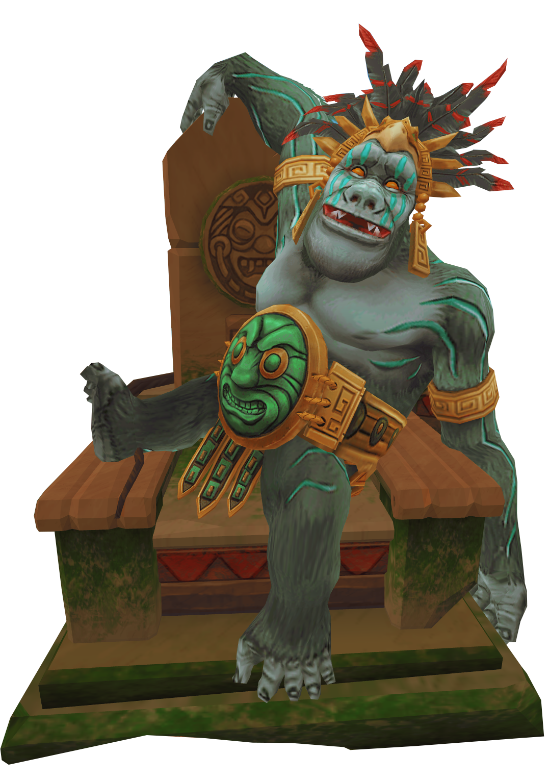 Marimbo is the patron goddess of the monkeys, worshipped on Ape Atoll. The monkey town of Marim is named after her, and she is also known to be cheeky and hedonistic. She ascended to godhood by having a drinking contest with an unknown god, which Marimbo won. Her opponent died of an overdose of alcohol. Marimbo then absorbed the god's divine power. Unlike the other gods, Marimbo was happy to leave when Guthix forced the gods out of Gielinor, as she disapproves of violent wars. However, a while after Sliske killed Guthix, she returned to Gielinor along with the other gods in the Sixth Age. Instead of warring, Marimbo was involved with a non-fatal contest with the god of cabbages and deliciousness, Brassica Prime.