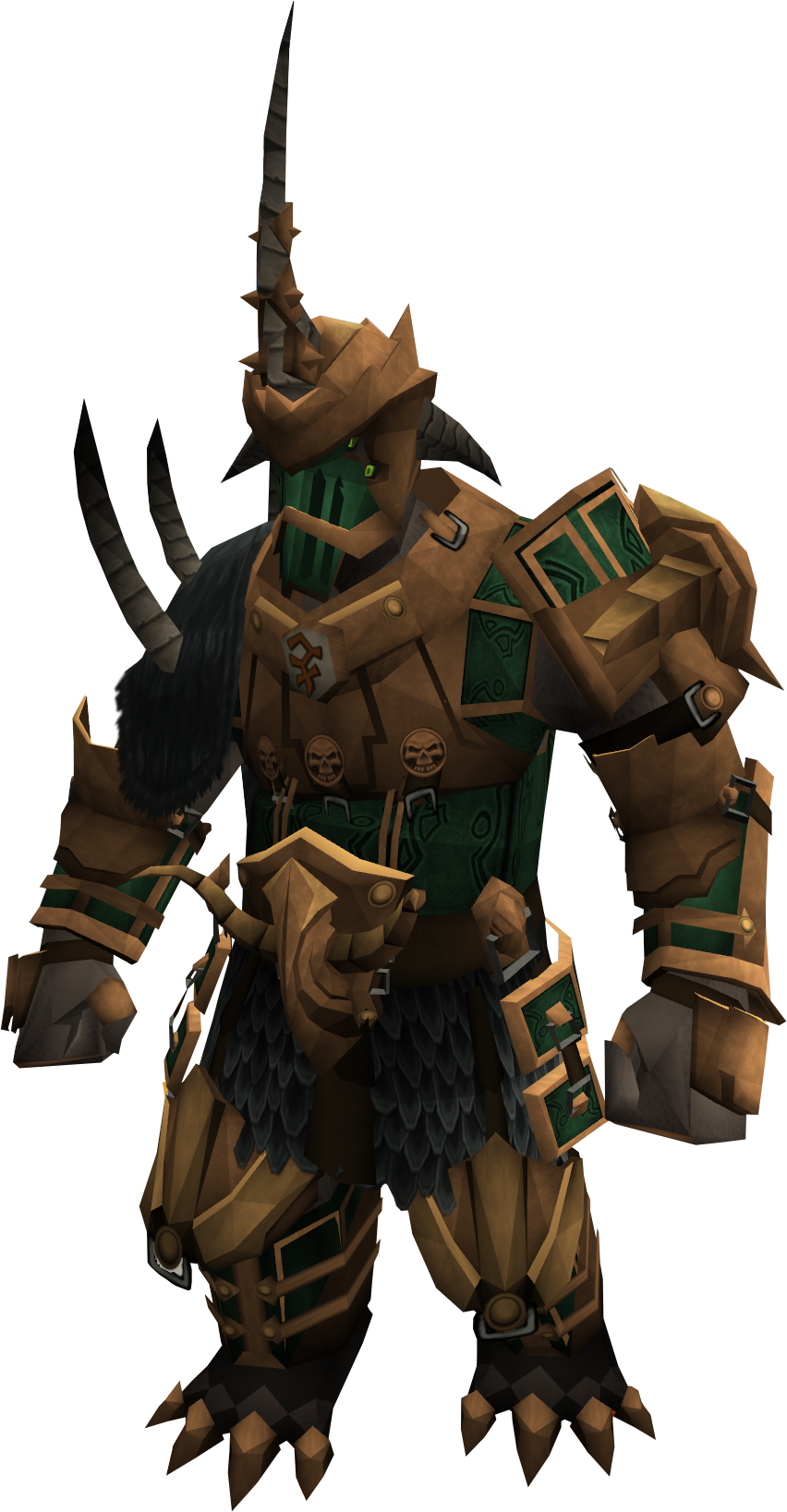 Bandos was the god of war with little other goal than to constantly revel in battle and bloodshed. Most of his followers were unintelligent races such as ogres, goblins, orks and hobgoblins. He was known to his followers as Big High War God and is usually only referred to as Bandos by his higher ranking followers. He arrived in Gielinor just after the God Wars commenced, eager to join the battle with his powerful followers (ourgs, raurgs and fayrgs). Apparently, the races that served him did not exist on Gielinor before his arrival and he brought them with him by force from Yu'biusk, a plane where most his followers originated, but he destroyed after he was banished. Bandos attempted to work around the Edicts and return to Gielinor in the Fifth Age, but his plans were thwarted. While many justifiably viewed Bandos as manipulative, selfish, and sadistic, Bandos believes that only the strong deserve to be rewarded and the weak can either serve as thoughtless weapons to the strong or fight to overthrow the strong, through which become strong themselves. This attitude extends to his followers who he claims he will not help nor feel empathy towards those he views as weak. Bandos returned shortly after the beginning of the Sixth age and was killed in a fierce battle with Armadyl, whom he had underestimated.