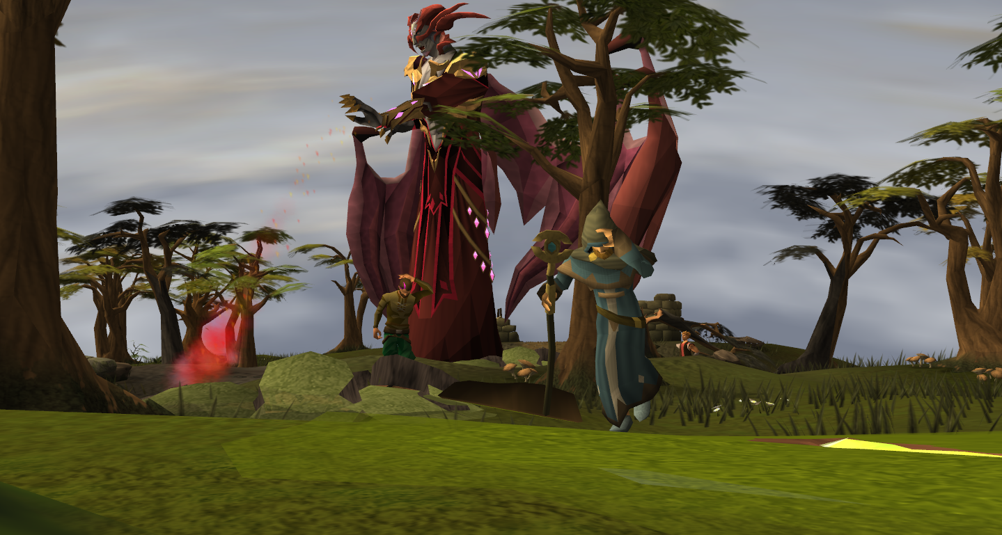 A trio of Elder gods, including Jas, Ful and Bik, in the process of creating Gielinor's basic shape.