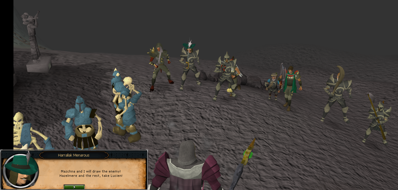 Lucien, now in possession of the legendary Staff of Armadyl, had begun to infiltrate the kingdoms of Misthalin, Asgarnia, and Kandarin with an efficient spy network, and had since gained the support of the Kinshra, Dagon'hai, and numerous other Zamorakian organisations. Hazelmere was part of a party of eight heroes sent into the deep Wilderness to confront Lucien directly; a desperate effort to stop him from invading the human kingdoms.