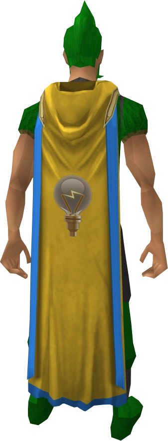 The hooded Invention cape (t) is the trimmed Cape of Accomplishment for the Invention skill with an Invention hood attached. It is the hooded and trimmed version of the Invention cape. It's made by using the Invention hood on the Invention cape (t), which can be reversed with the right-click "Detach" option. To be obtained, the player must have level 99 Invention and one other level 99 skill.
