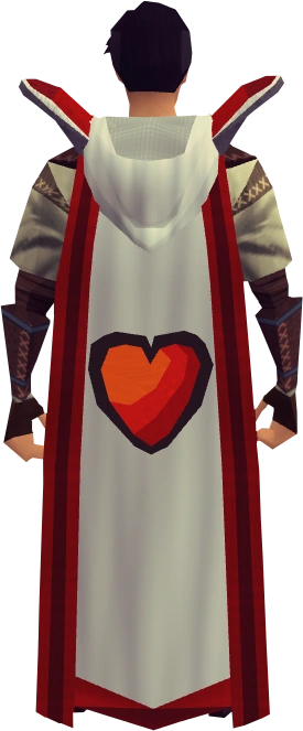 The hooded constitution cape (t) is the trimmed Cape of Accomplishment for the Constitution skill with a constitution hood attached. It is the trimmed version of the hooded constitution cape and the hooded version of the constitution cape (t). It's made by using the constitution hood on the constitution cape (t), which can be reversed with the right-click "Detach" option. It requires level 99 in Constitution and level 99 in one other skill. It has a white colour with a red trim.